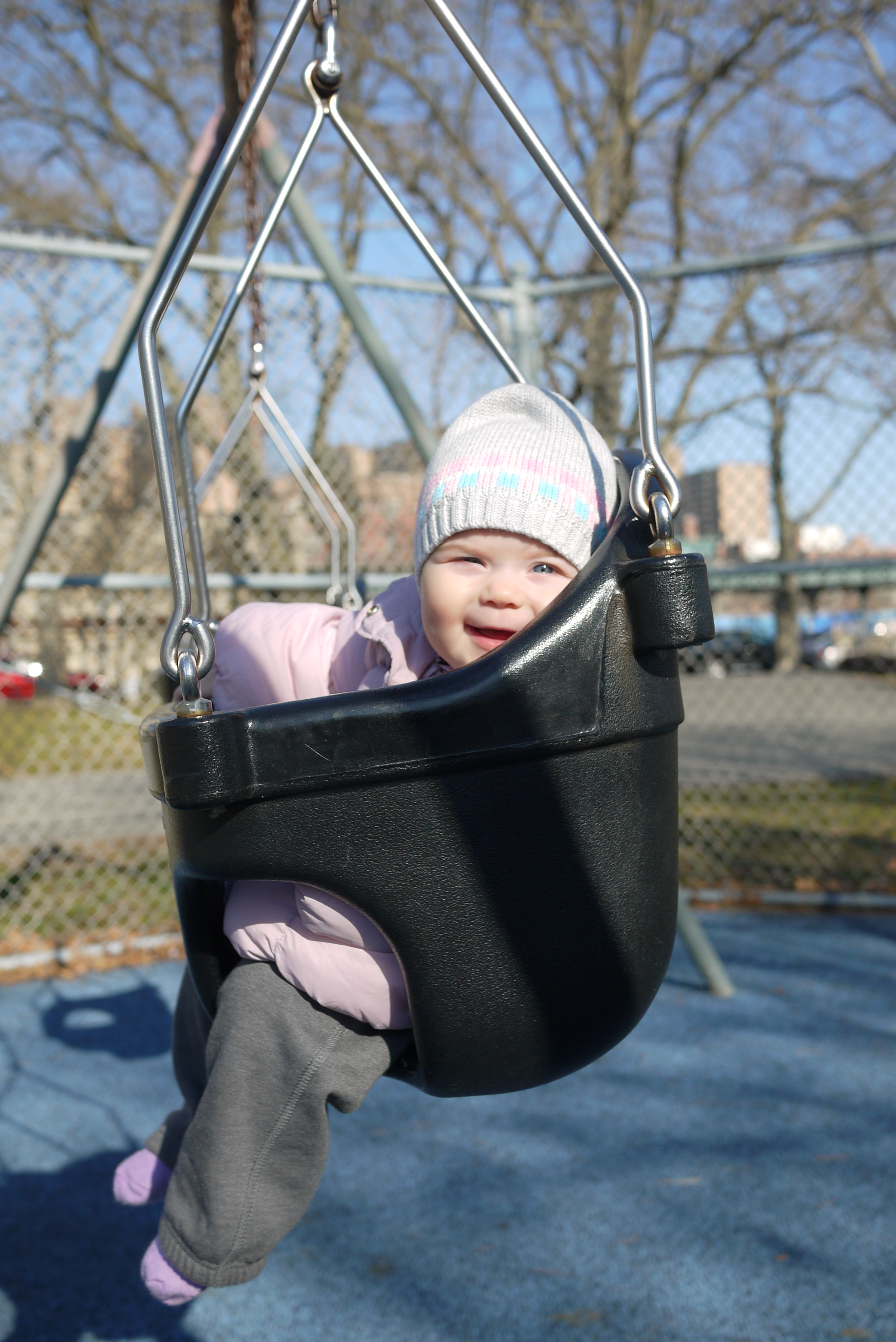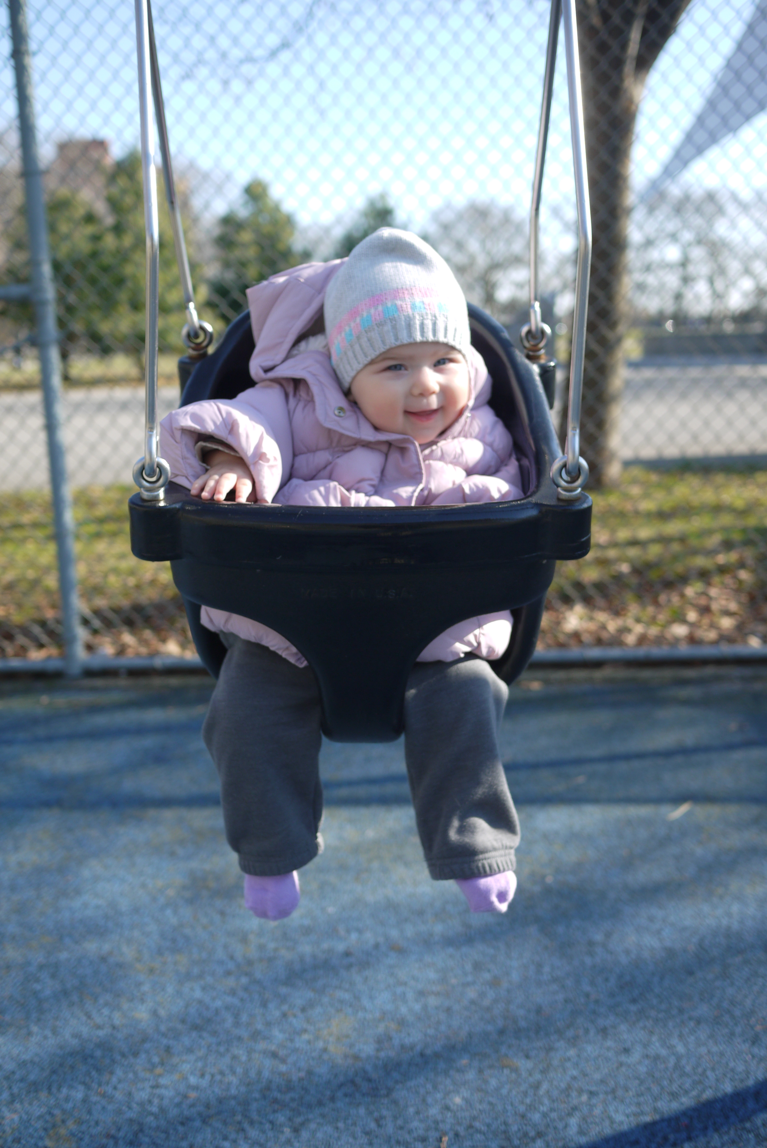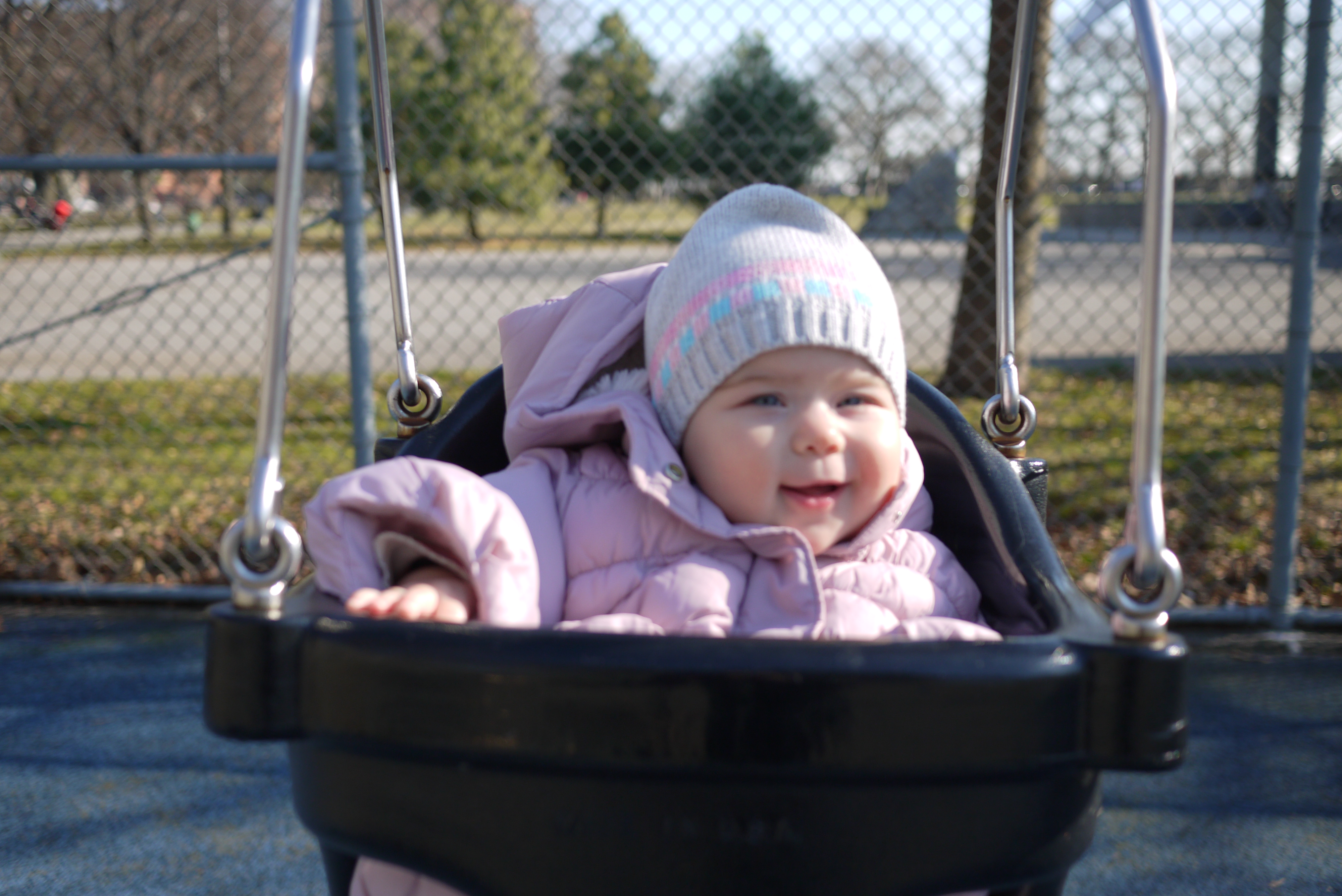 When the weather is nice you can really enjoy yourself outside. There are so many things to do: watch the squirrels run around, children play, people pass by, birds fly, and tree branches move with the wind. I go to the park almost every day, but usually I’m fast asleep during my strolls. Today was a different kind of day. The weather was so good that I decided to enjoy my walk wide awake. And what a time I had! We went to the playground where I went on a swing for the very first time. It was amazing, I should do this every day!