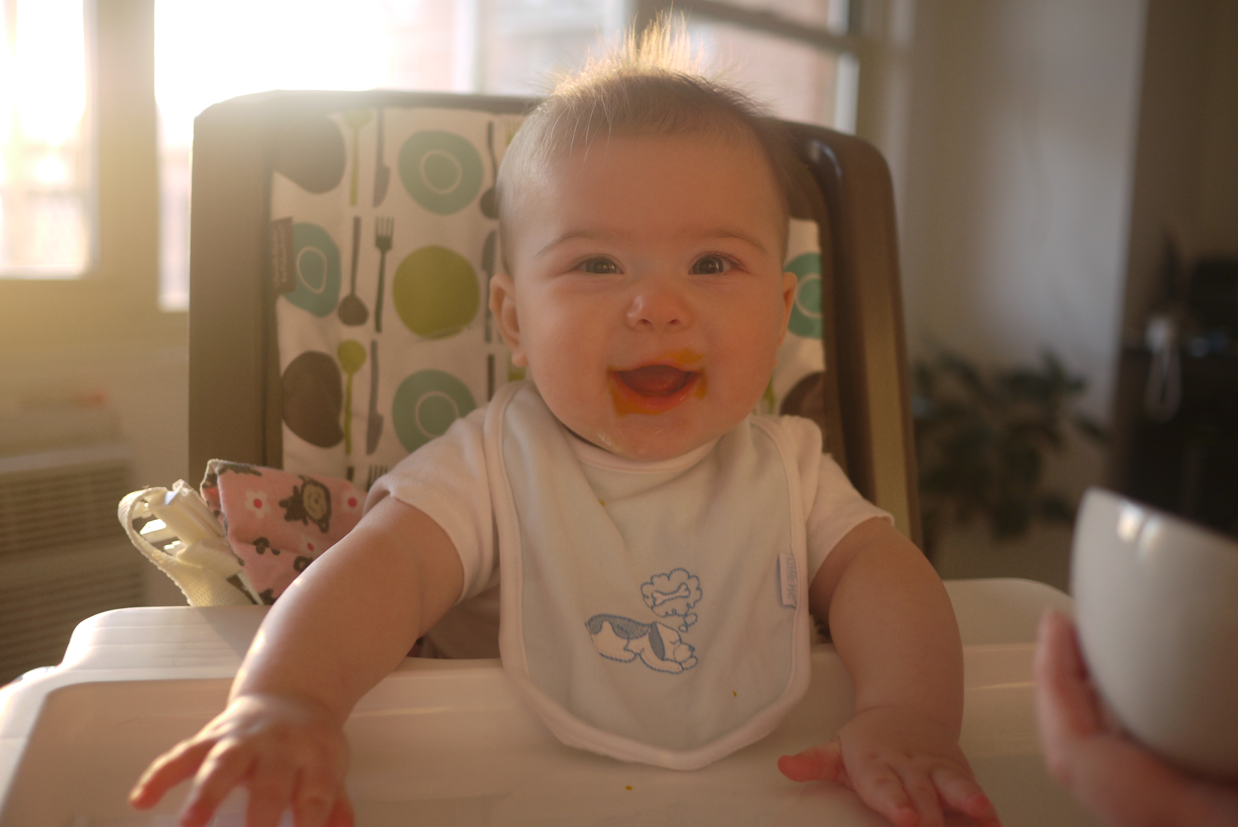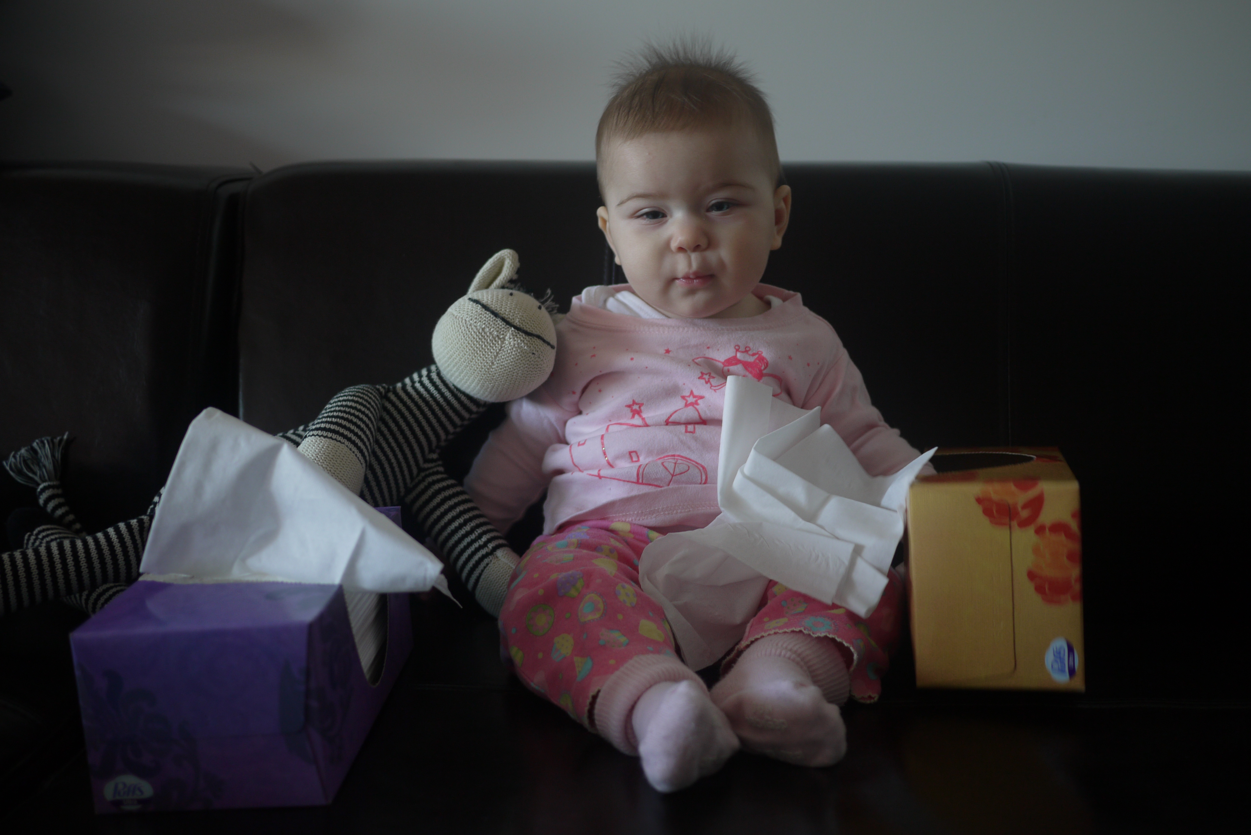 It’s no fun being sick! I can’t sleep, I can’t eat, and even playing brings me little joy. The only thing I can do is to chew on my toys, since I have my very first budding of a tooth on the bottom right side. Although you cannot see it yet, if you give me something small, I’ll leave an impression :)