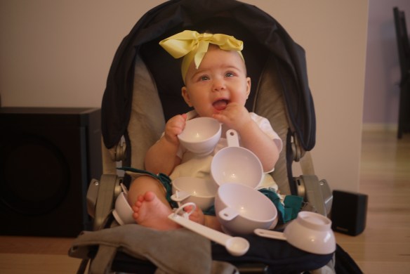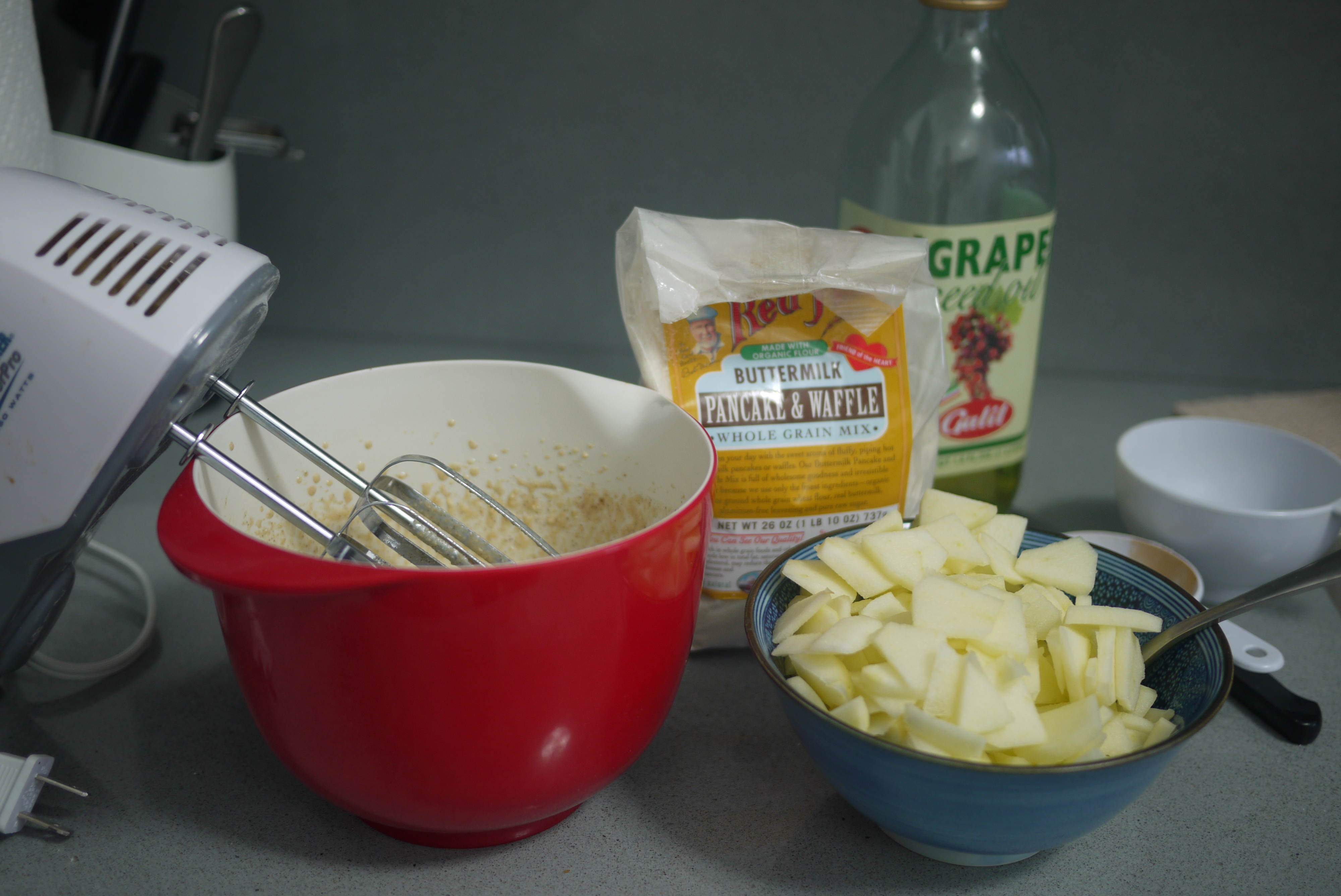 The weather was terrible today in the morning and even when the rain stopped it was really windy. I decided not to go outside, and instead, to make the time pass by quicker, I asked to help make mini apple pancakes. Of course I had to get properly prepared for the chore: I put on my little apron, tied my hair with a bow, got my spatula and my measuring cups. The hardest part was to decide which cup to use, so I tried them all. I inspected all the ingredients and we were done in no time.